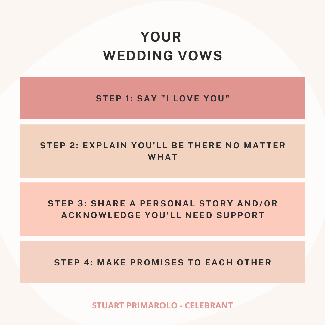 Step 1: Say "I love you" It's amazing how many vows forget to mention it, we get so wrapped up in the stories, the promises or the anecdote that will get the laughs or tears, that we forget to say those three special words. I love you.